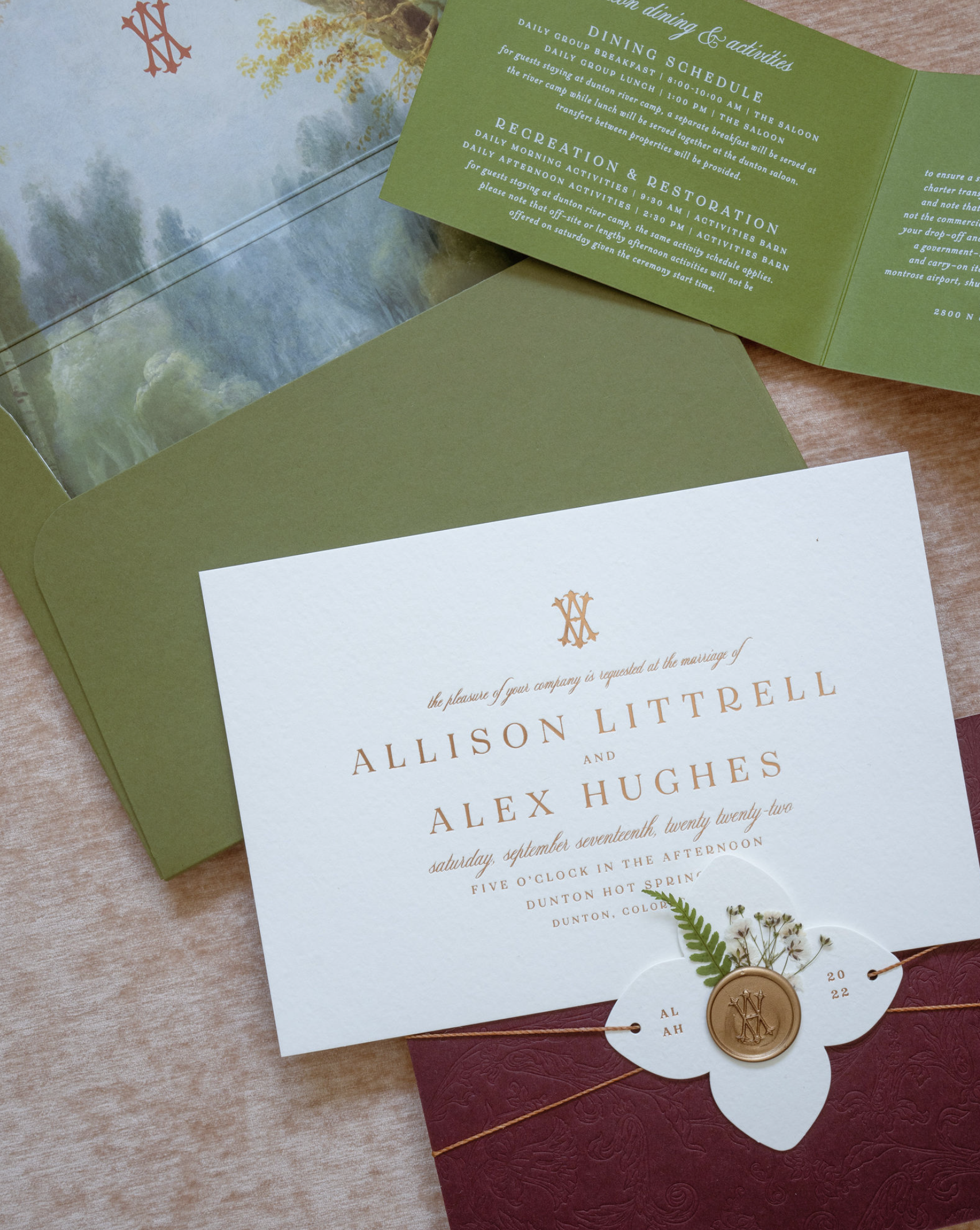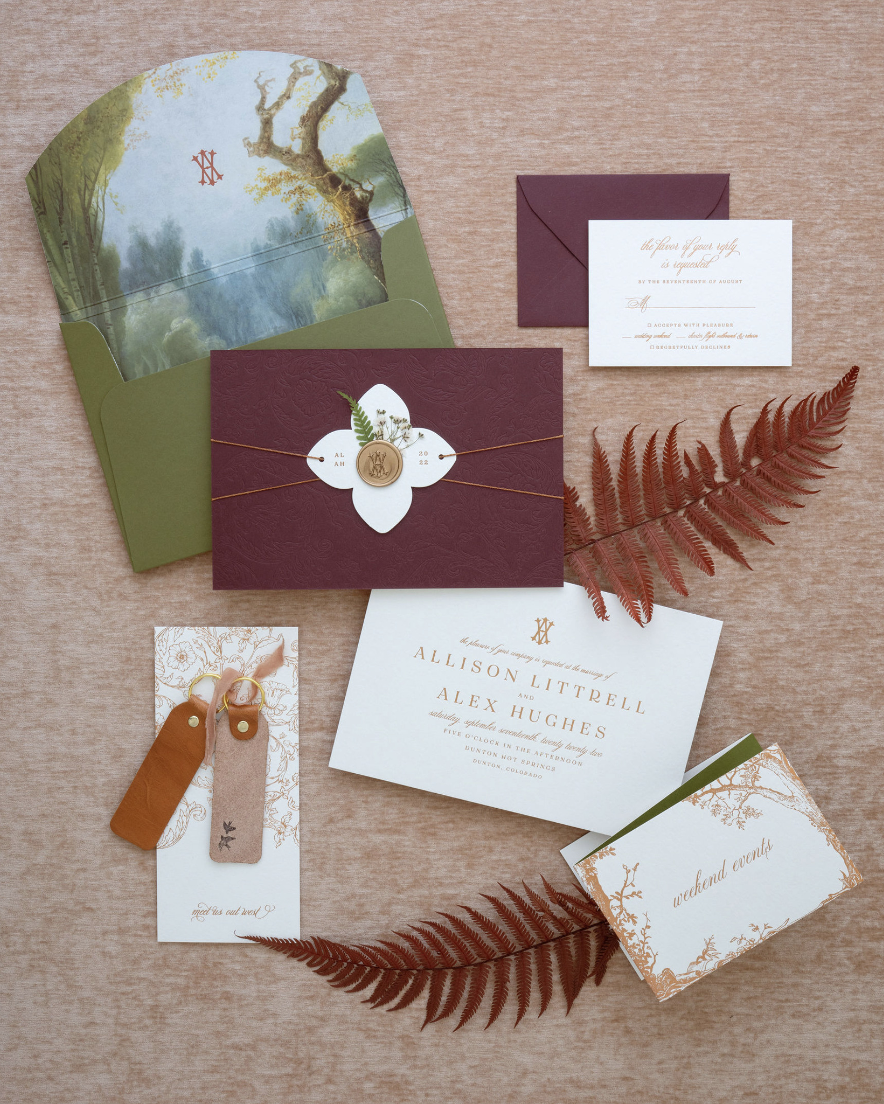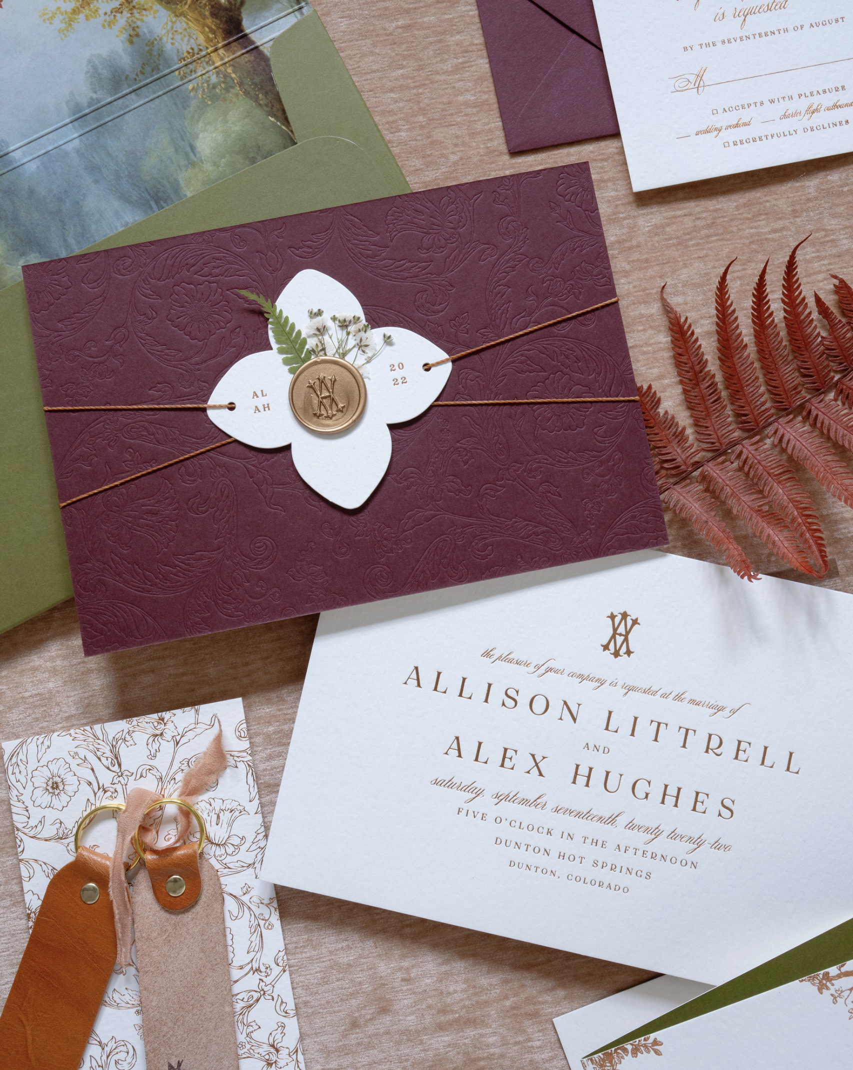 Rustic, natural, AND a little bit western WAS THE COUPLE’S VISION FOR THEIR UNIQUE WEDDING. SET IN A GHOST TOWN IN COLORADO, THE COUPLE BROUGHT AN INTIMATE GROUP OF THEIR CLOSEST FRIENDS TOGETHER TO EXPERIENCE AN UNFORGETTABLE WEEKEND. WE DESIGNED A SUITE THAT COMBINED DRIED FLORALS, NATURAL SEED PAPER, AND A RICH COLOR PALETTE INSPIRED BY THE BRIDE’S FAVORITE PERIOD IN ART HISTORY: THE FLEMISH RENAISSANCE.