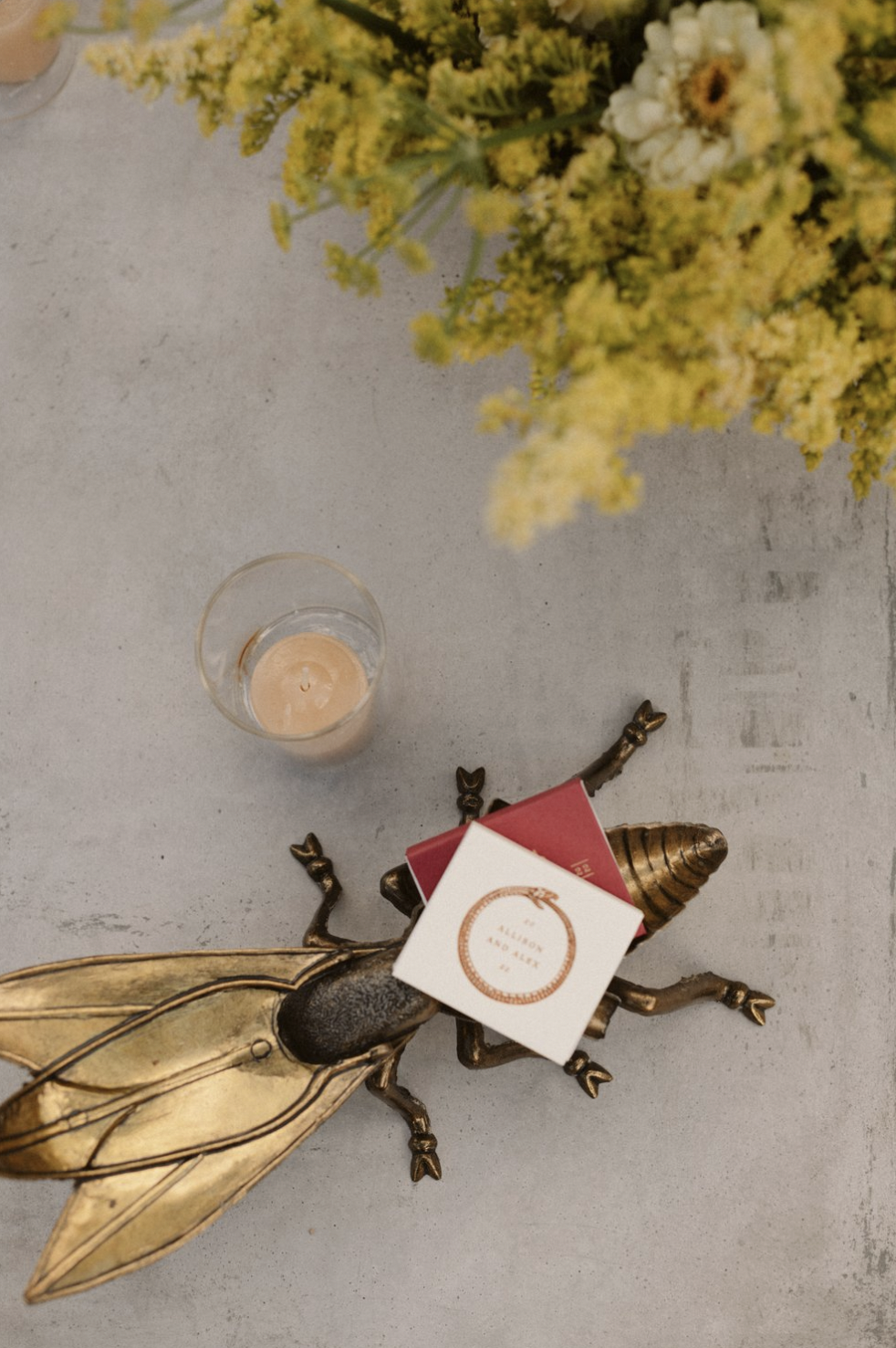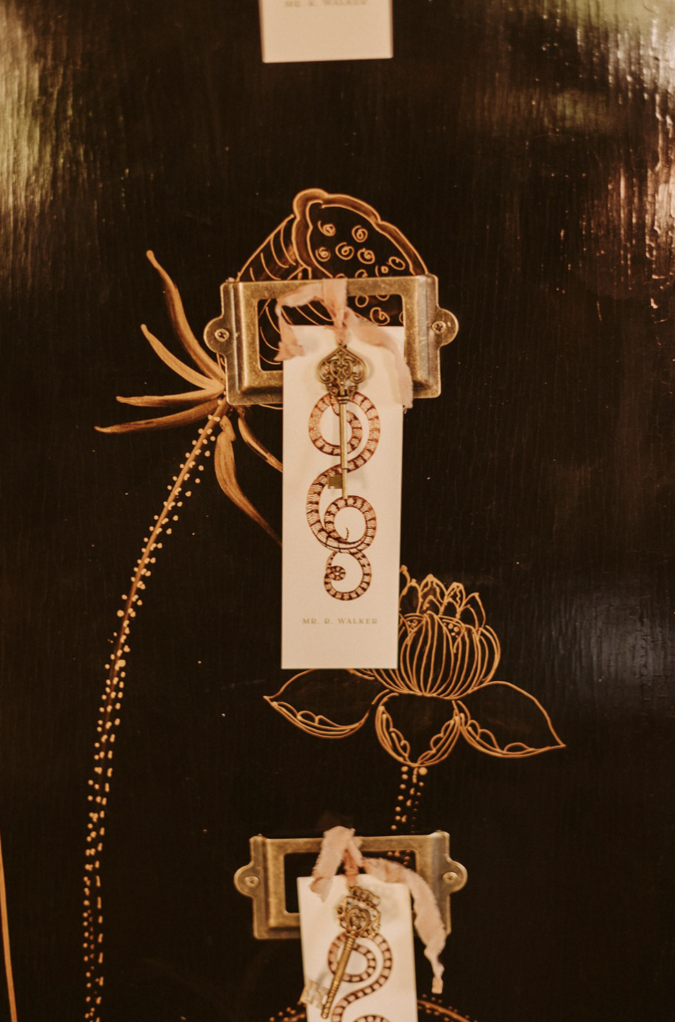 THE INVITATION SUITE FEATURED AN EMBOSSED FLORAL PATTERN AND DIE CUT TAG WITH DELICATE DRIED FLORALS, PERFECTLY MIXING WESTERN AND RENAISSANCE AESTHETICS. ADDITIONALLY THE BRIDE WANTED AN UNFORGETTABLE KEEPSAKE FOR GUESTS, SO WE DESIGNED CUSTOM LUGGAGE TAGS FOR EACH LOVED ONE.