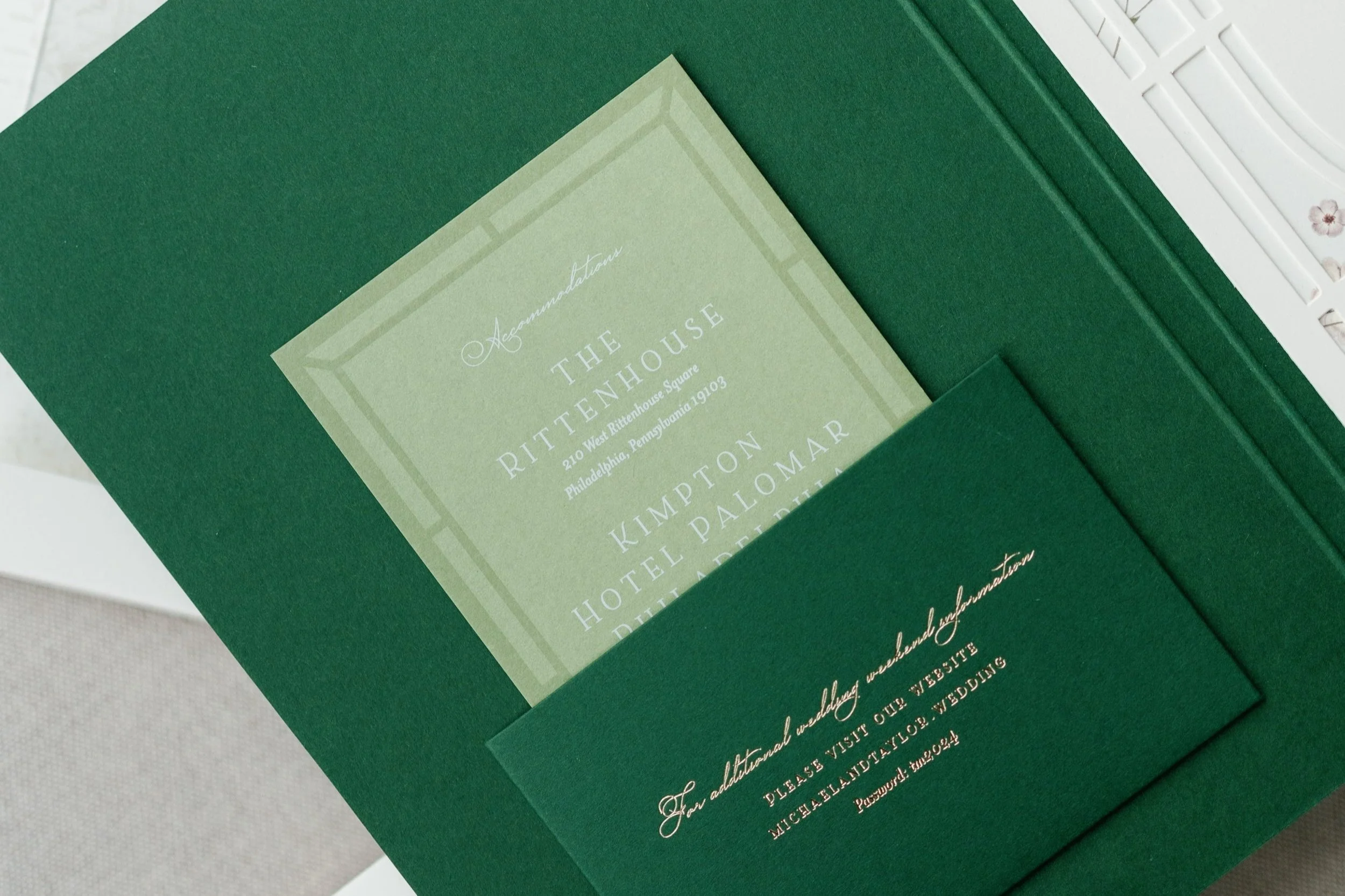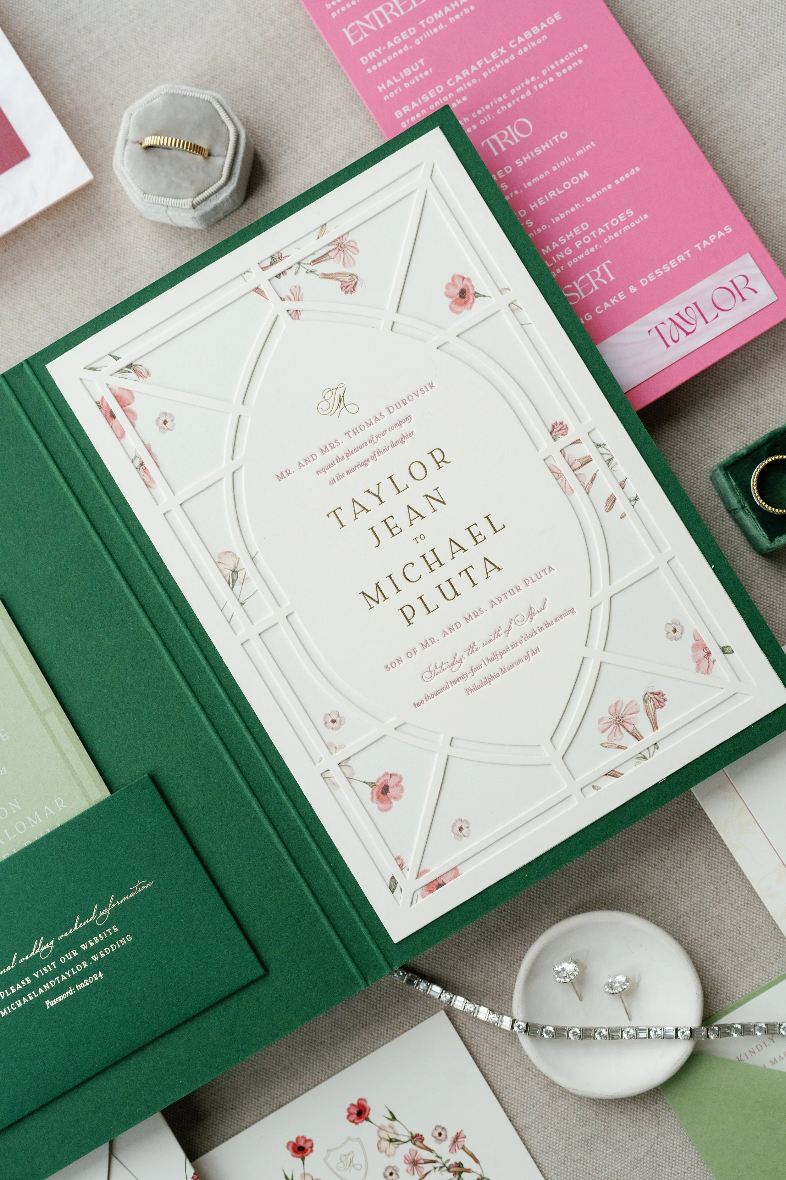 TAKING INSPIRATION FROM THE ARCHITECTURE INSIDE THE PHILADELPHIA MUSEUM OF ART, WE TOOK THE INVITATION TO THE NEXT LEVEL BY ADDING A CUSTOM DIE CUT INVITATION. DELICATE PINK FLOWERS PEEK THROUGH EACH LAYER TO CREATE A SENSE OF BEAUTY AND INTEREST FOR GUESTS, COMPLIMENTING THE LETTERPRESS TEXT AND GOLD FOIL.