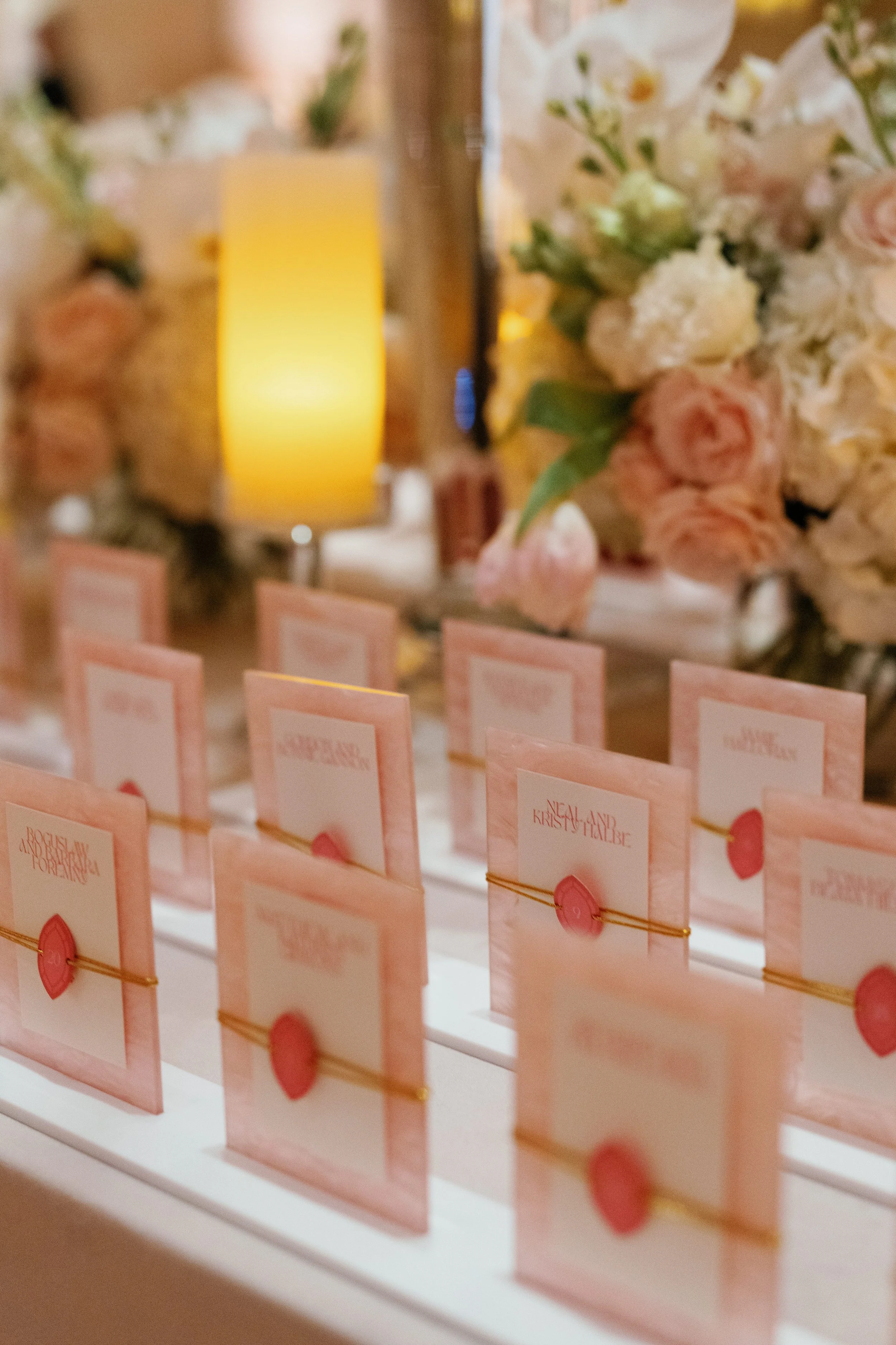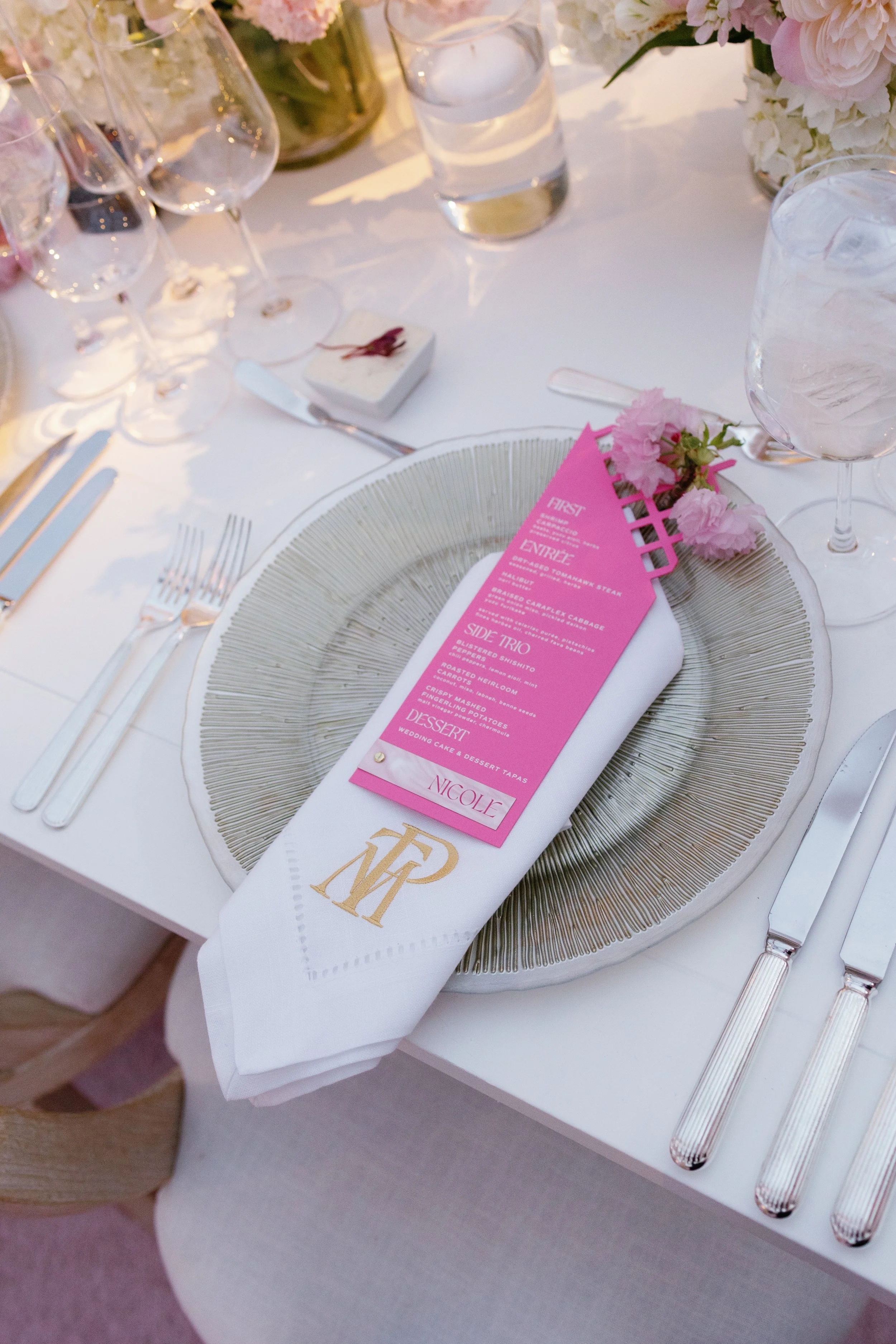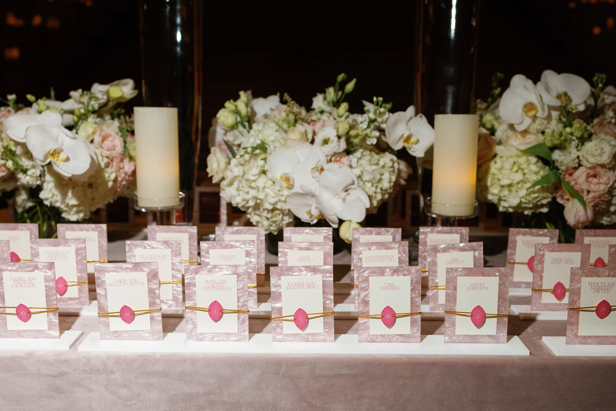 FACED WITH THE REQUEST TO DESIGN A MENU THAT INCORPORATED THE CLIENT’S FLOWERS, WE CREATED A CUSTOM LASER CUT LATTICE. WE PAIRED THE BRIGHT PINK PAPER WITH PLACE CARDS THAT MATCH THE PEARL ACRYLIC USED FOR THE GUEST’S ESCORT CARDS, CREATING A COHESIVE LOOK FOR THE RECEPTION.