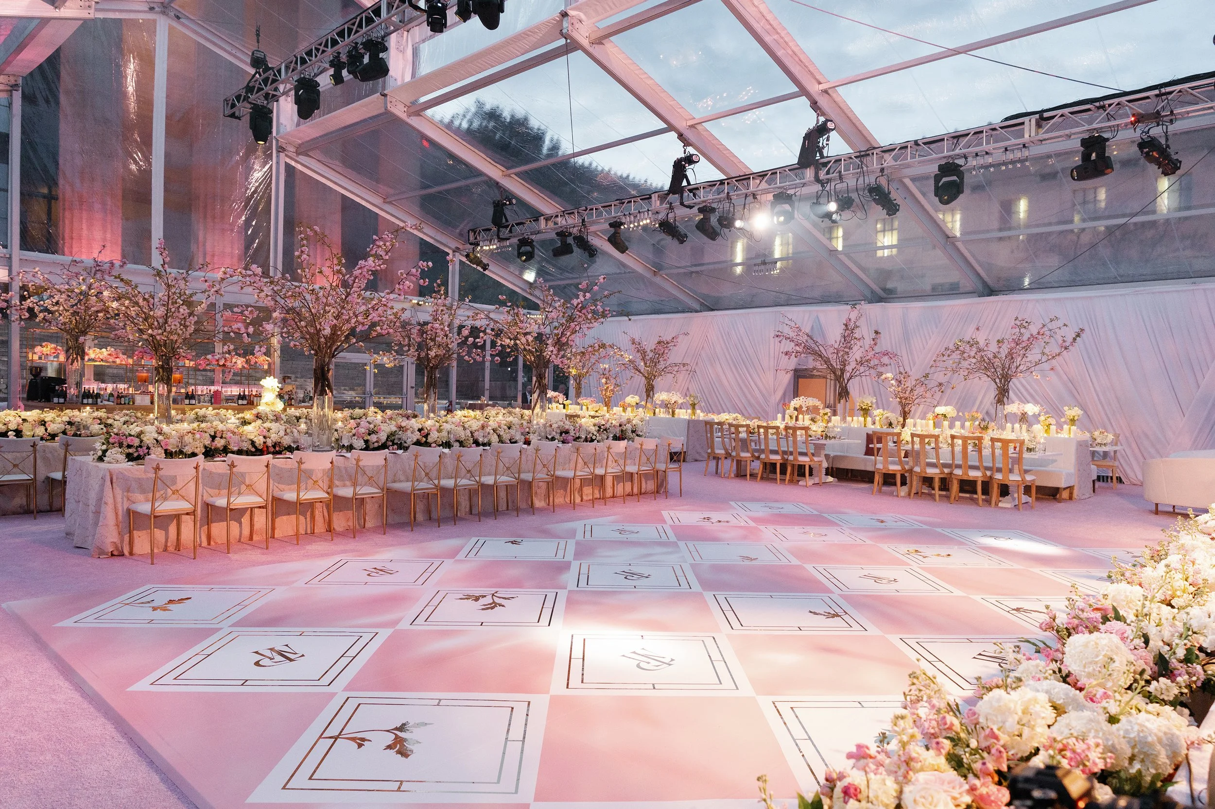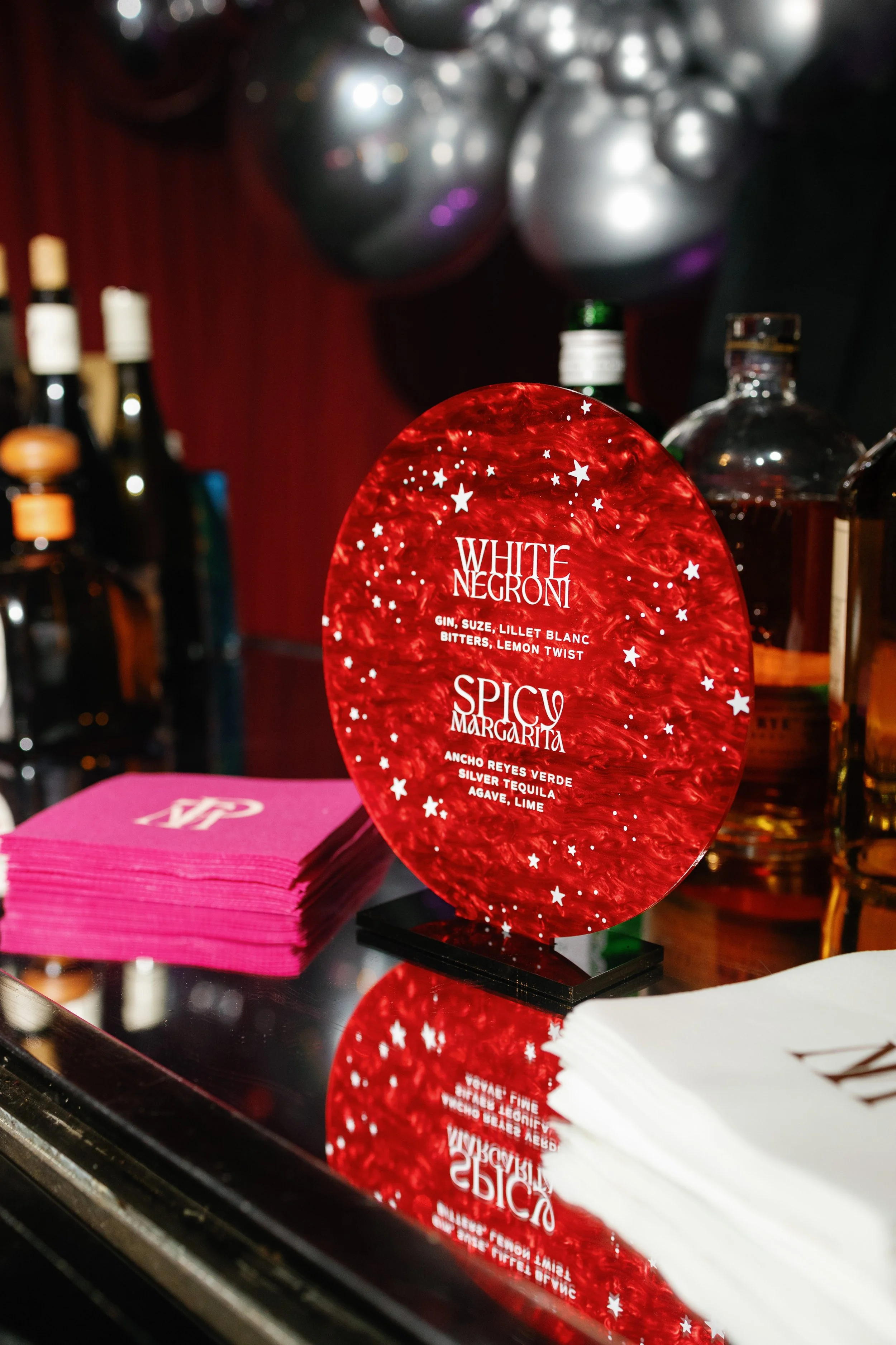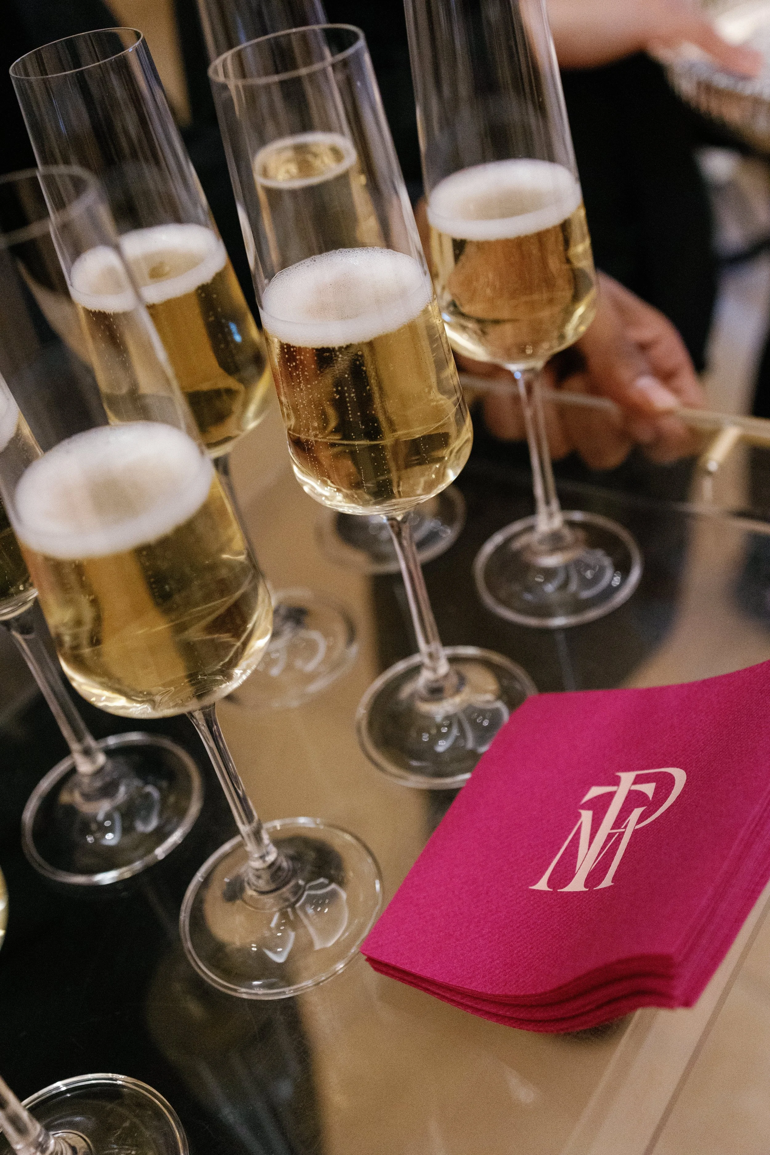 FACED WITH THE REQUEST TO DESIGN A MENU THAT INCORPORATED THE CLIENT’S FLOWERS, WE CREATED A CUSTOM LASER CUT LATTICE. WE PAIRED THE BRIGHT PINK PAPER WITH PLACE CARDS THAT MATCH THE PEARL ACRYLIC USED FOR THE GUEST’S ESCORT CARDS, CREATING A COHESIVE LOOK FOR THE RECEPTION.