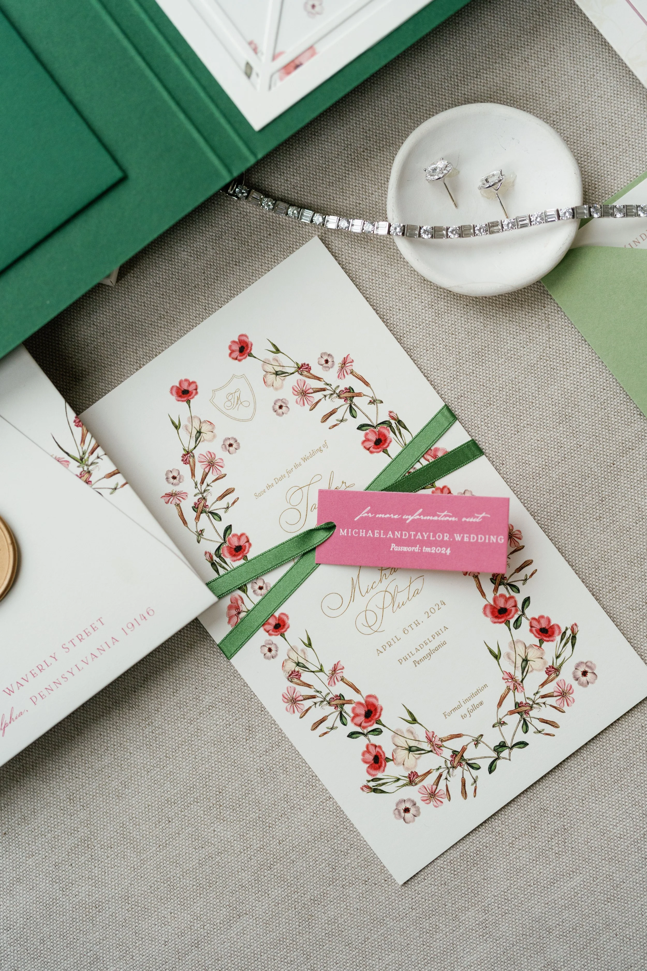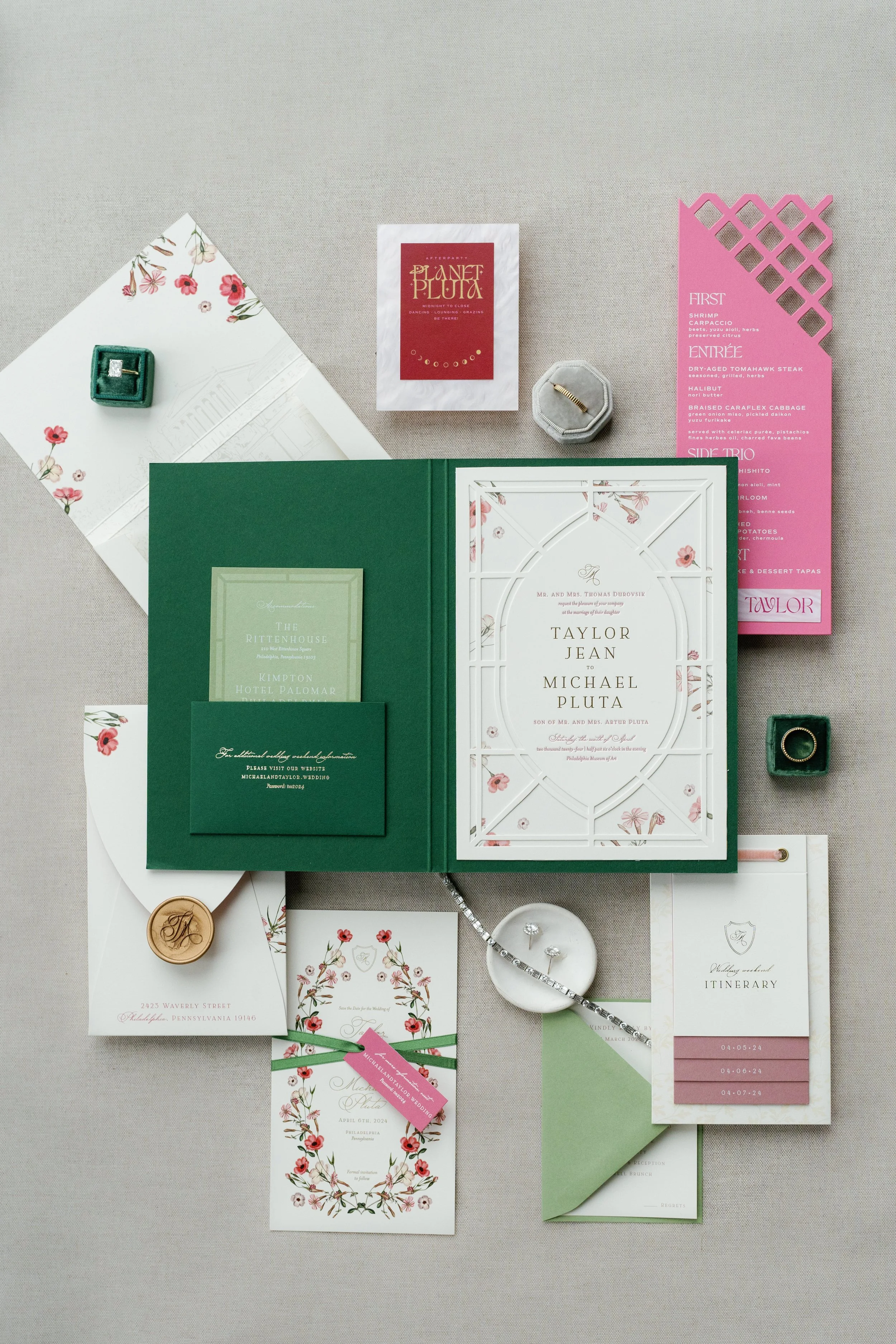 SET IN THE HISTORIC CITY OF PHILADELPHIA, ThIS STUNNING wedding took place IN THE BEAUTIFUL PHILADELPHIA MUSEUM OF ART. THE DESIGN focused on colorful spring florals and shapes inspired by the Museum’S architecture. A custom CREST featuring the COUPLE’S INITIALS was used throughout BOTH THE SAVE THE DATE AND INVITATION SUITE. CLEAN typography, gold foil, AND CUSTOM DIE CUT LAYERS added a CLASSIC AND ELEGANT touch to the DESIGN.