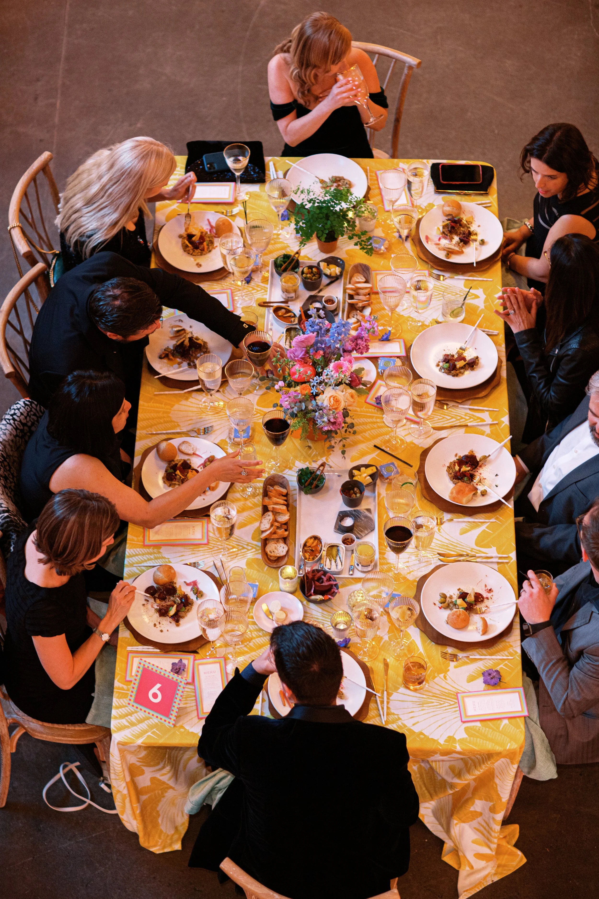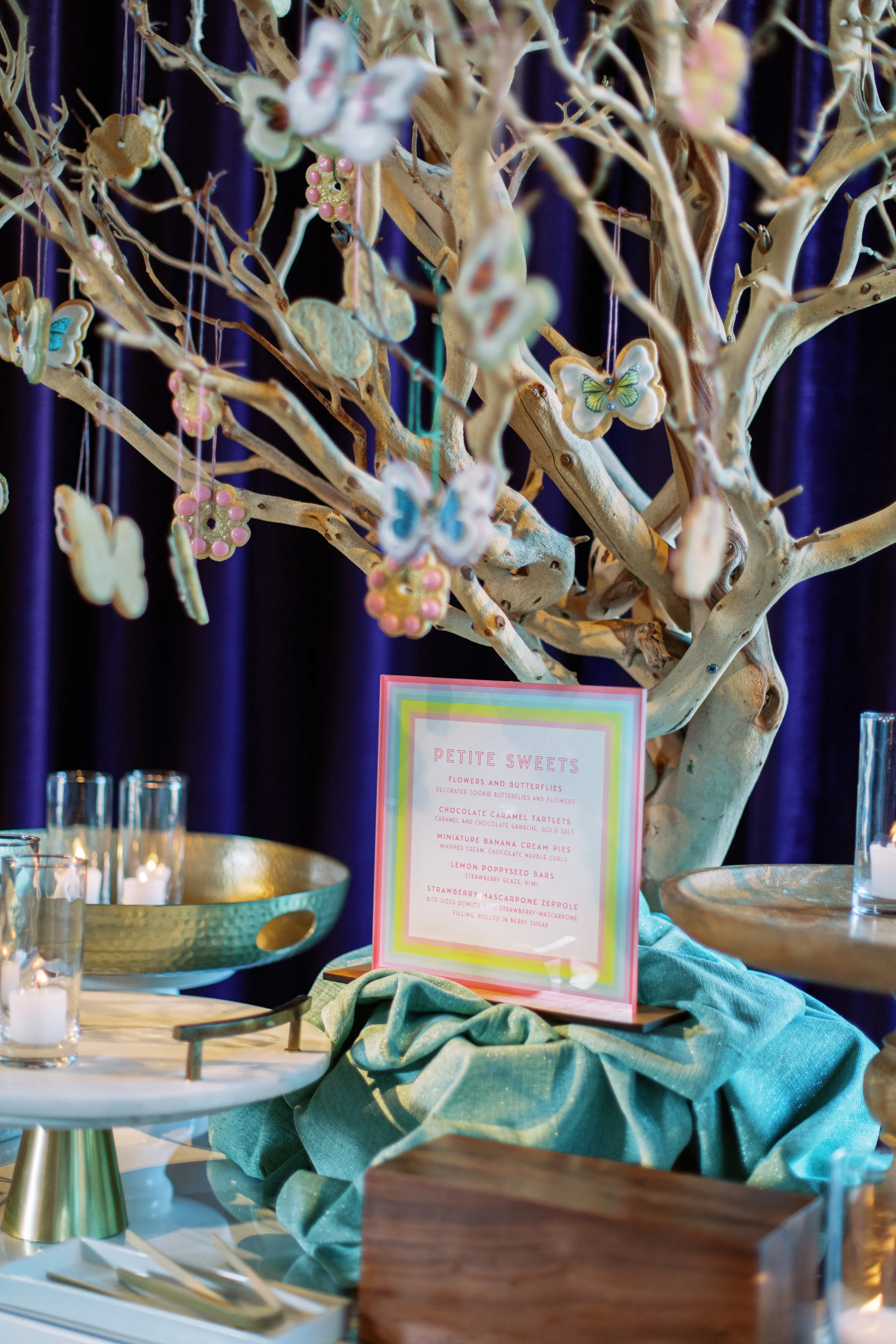 CARRYING THE INVITATION SUITE THROUGHOUT THE NIGHT, WE DESIGNED A CUSTOM MENU SLEEVE, FOOD SIGNAGE, TABLE NUMBERS, AND MORE FOR THE BAT MITZVAH GIRL AND ALL OF HER CLOSEST FRIENDS.