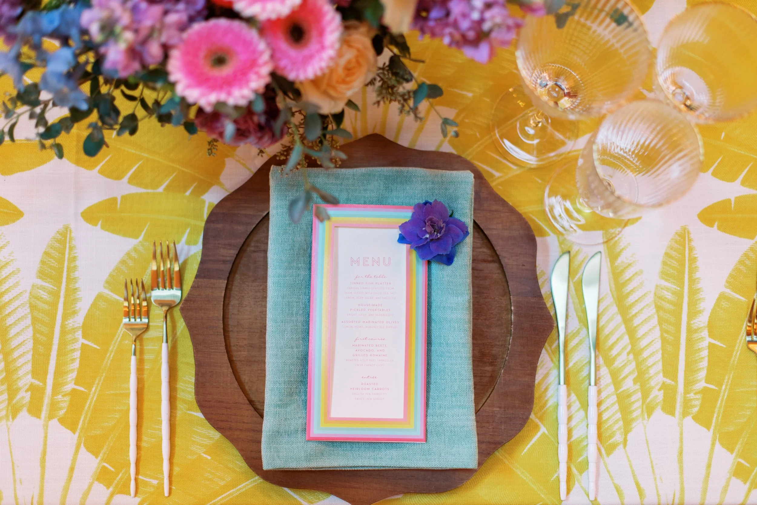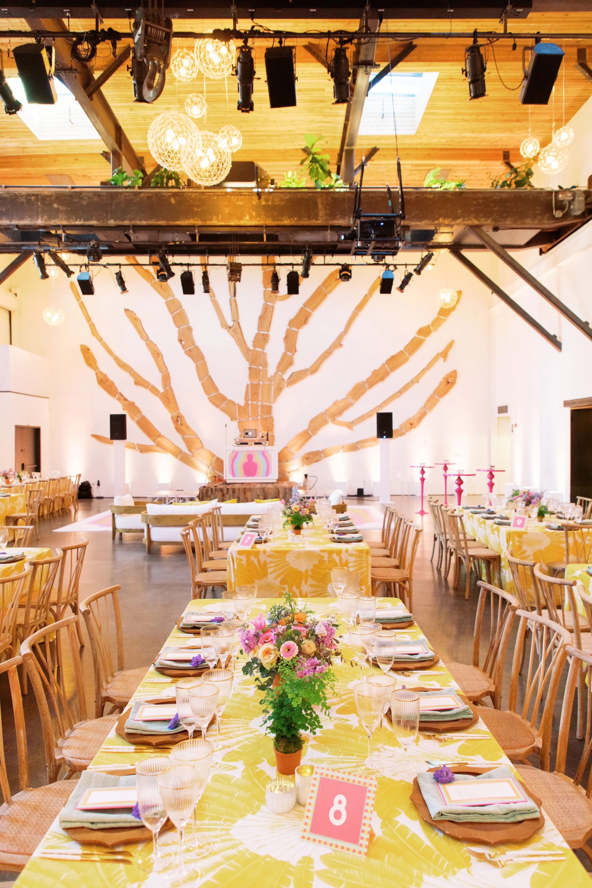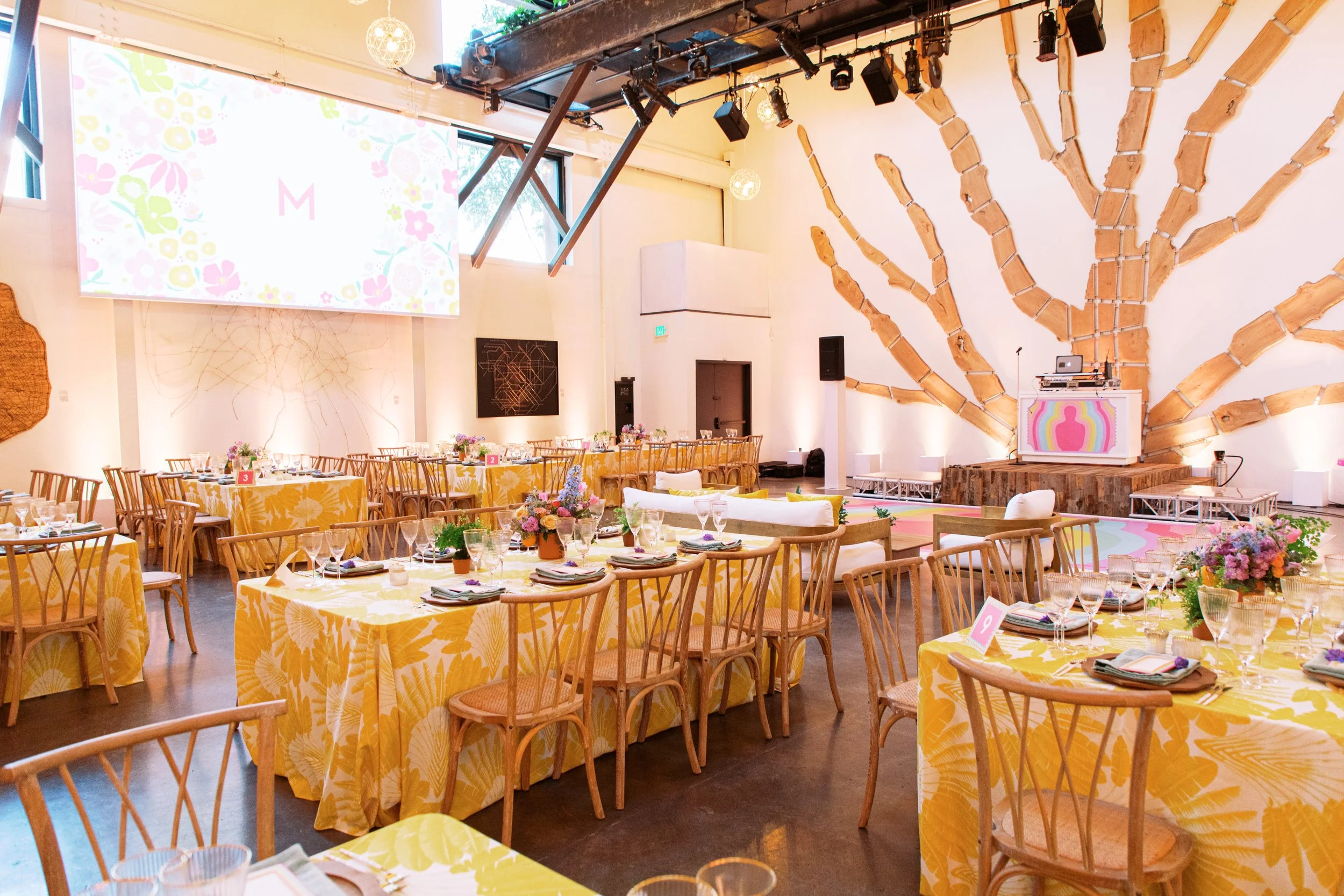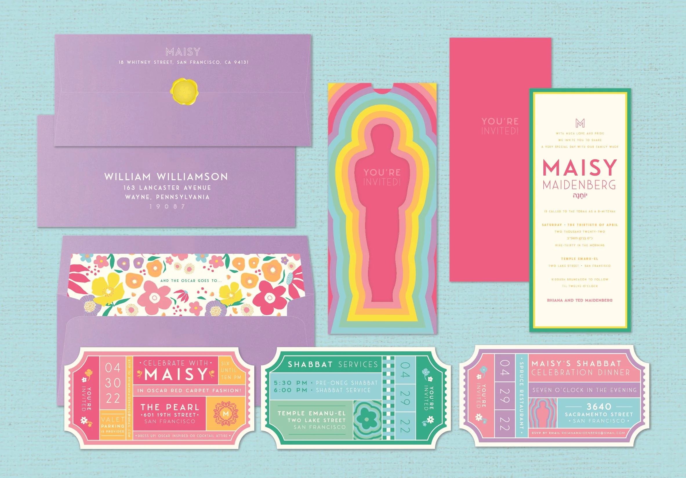 THIS BAT MITZVAH CELEBRATES ALL THE THINGS THAT MAKE THE BAT MITZVAH GIRL WHO SHE IS; BOTANICALS, A LOVE FOR THE OSCARS, AND THE LGBT FLAG. COMBINING THESE ASPECTS INTO ONE SPECTACULAR EVENT WAS A LABOR OF LOVE. WANTING TO STEP AWAY FROM THE TYPICAL RED AND GOLD OSCARS THEME, WE DESIGNED A ONE-OF-A-KIND INVITATION SUITE THAT WAS VIBRANT, COLORFUL, AND ARTISTIC. A CUSTOM DIE CUT INVITATION SLEEVE AND CUTE MOVIE TICKET STYLE CARDS GAVE EACH GUEST A TASTE OF THE EXCITING EVENT TO COME.