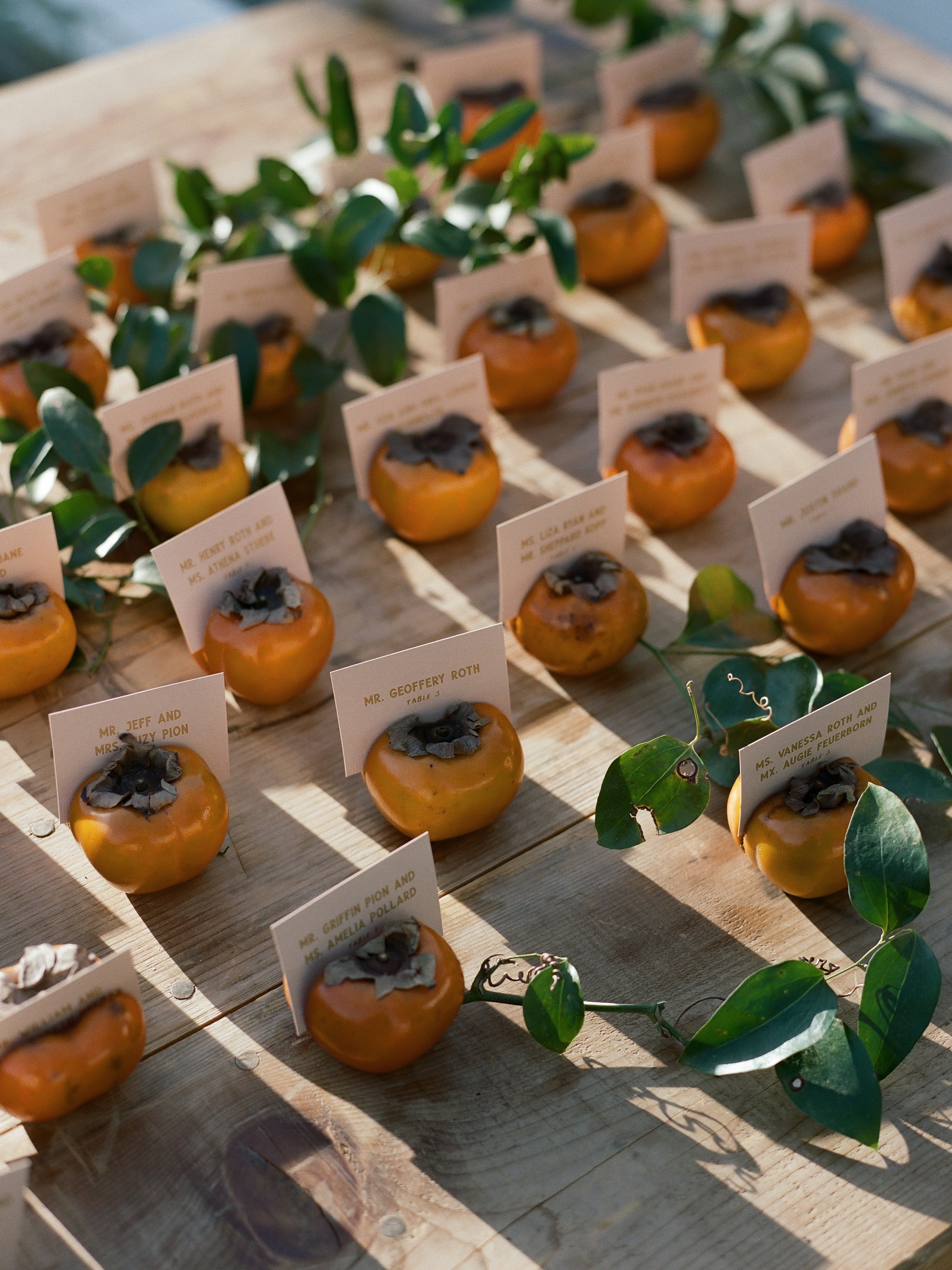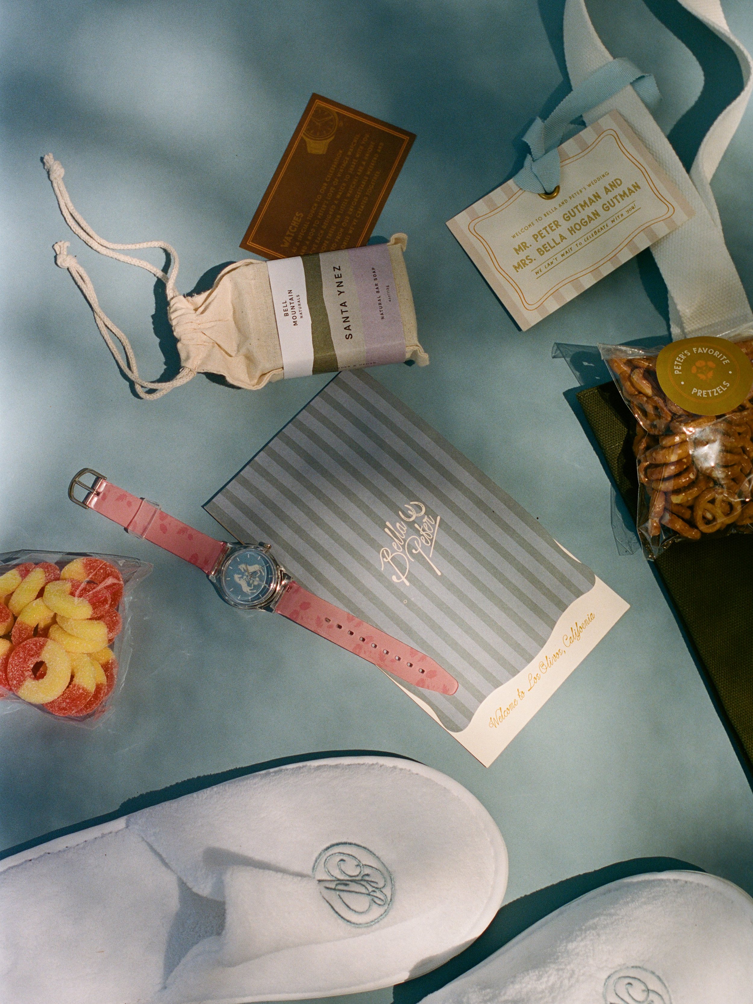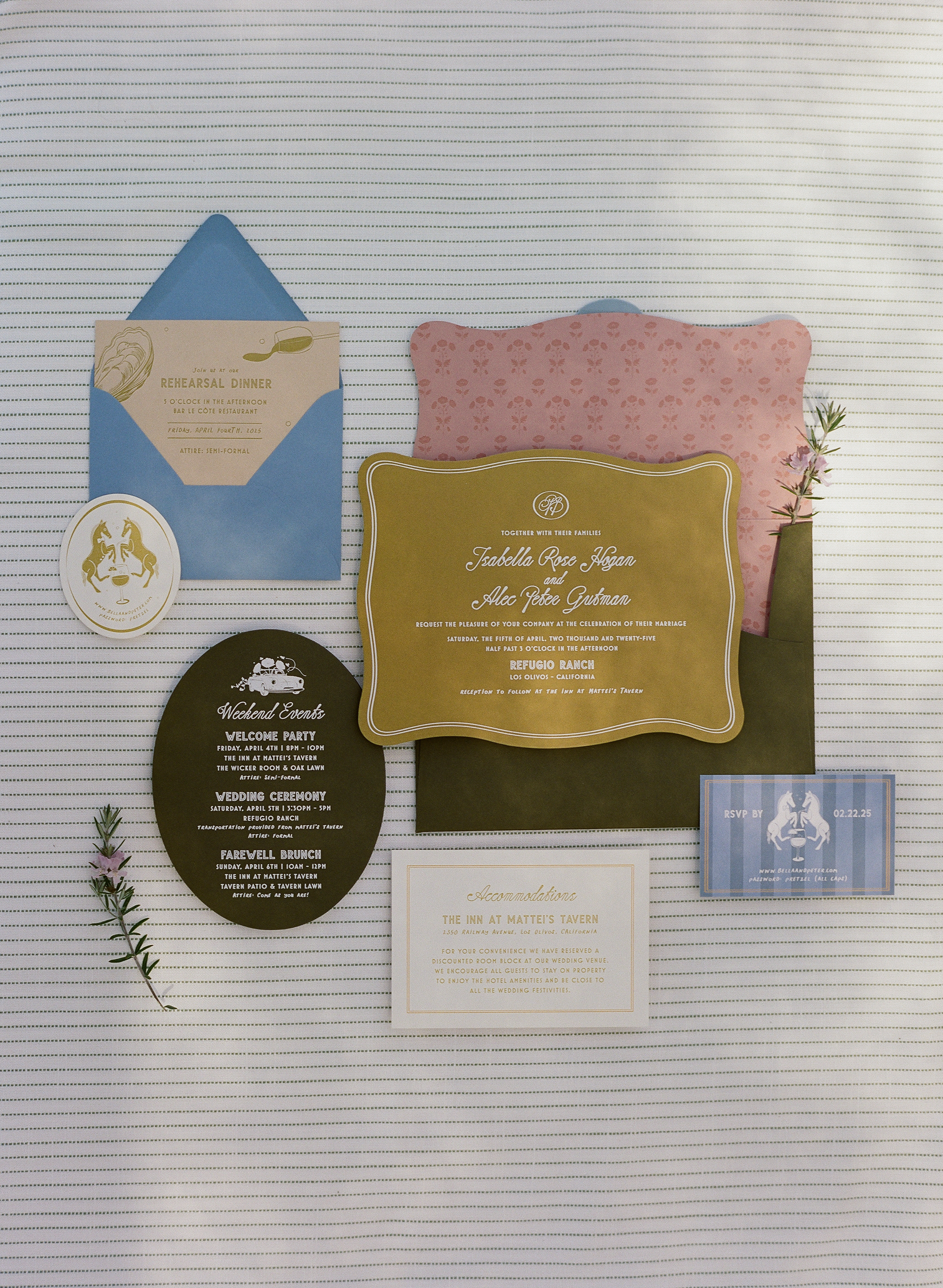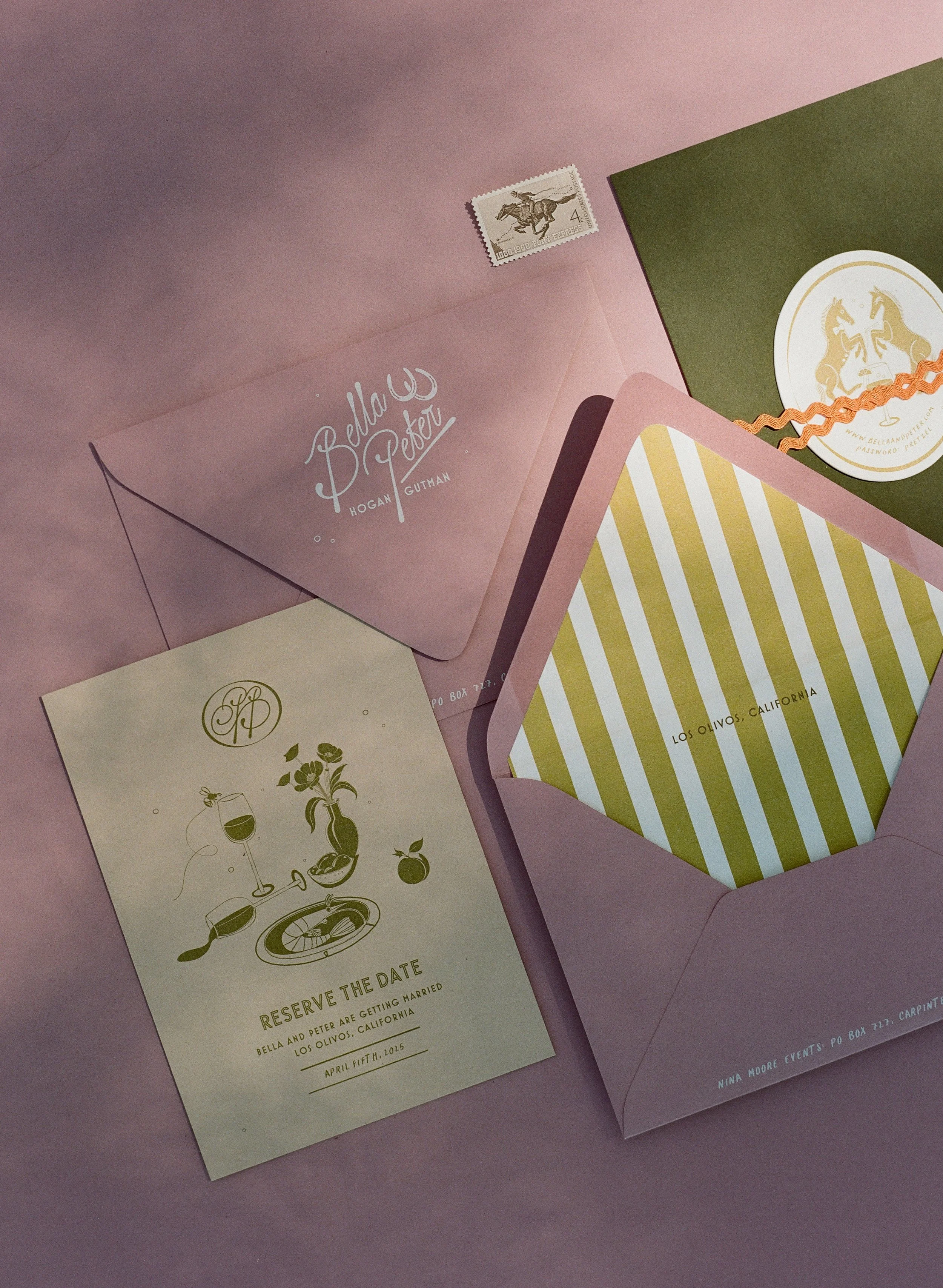 This springtime wedding in the Santa Ynez Valley welcomed guests for a celebration inspired by the couple’s story and the charm of California wine country. Beginning with old-world supper club–inspired save the dates, the stationery hinted at the weekend ahead with playful details like peaches, olives, and shrimp that nodded to the region and the welcome dinner. A soft stripe motif carried from the paper goods into the wedding day linens, while a palette of dusty rose, olive, dusty blue, and citrus tones created a romantic yet fresh feel.