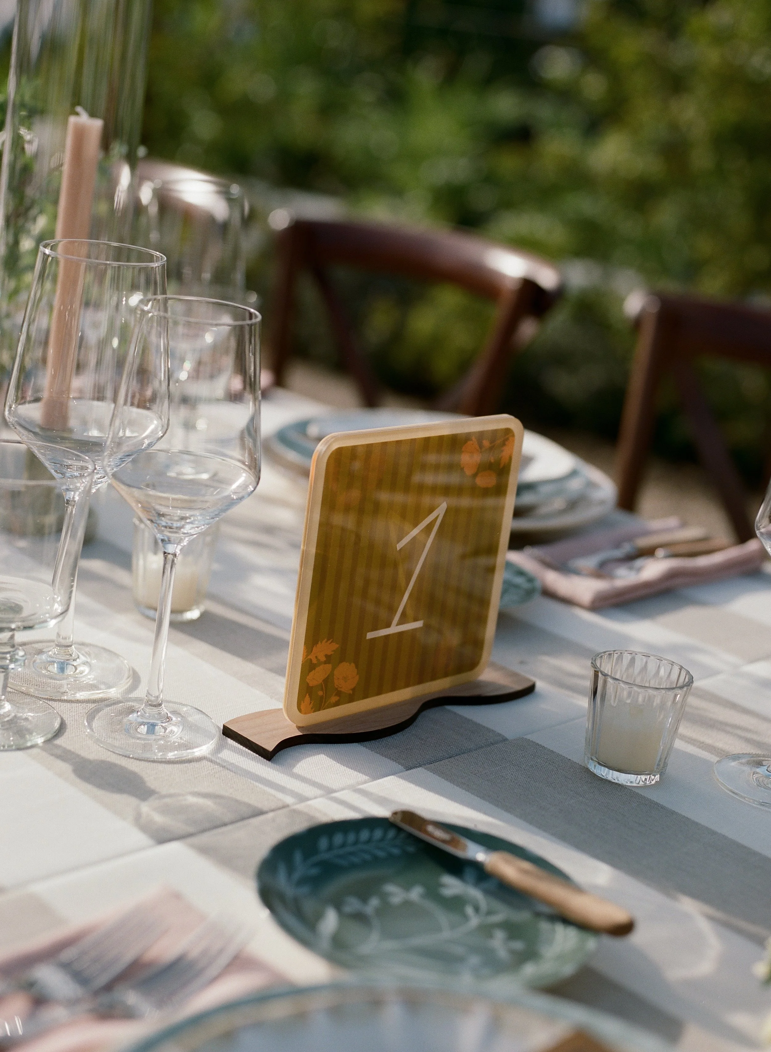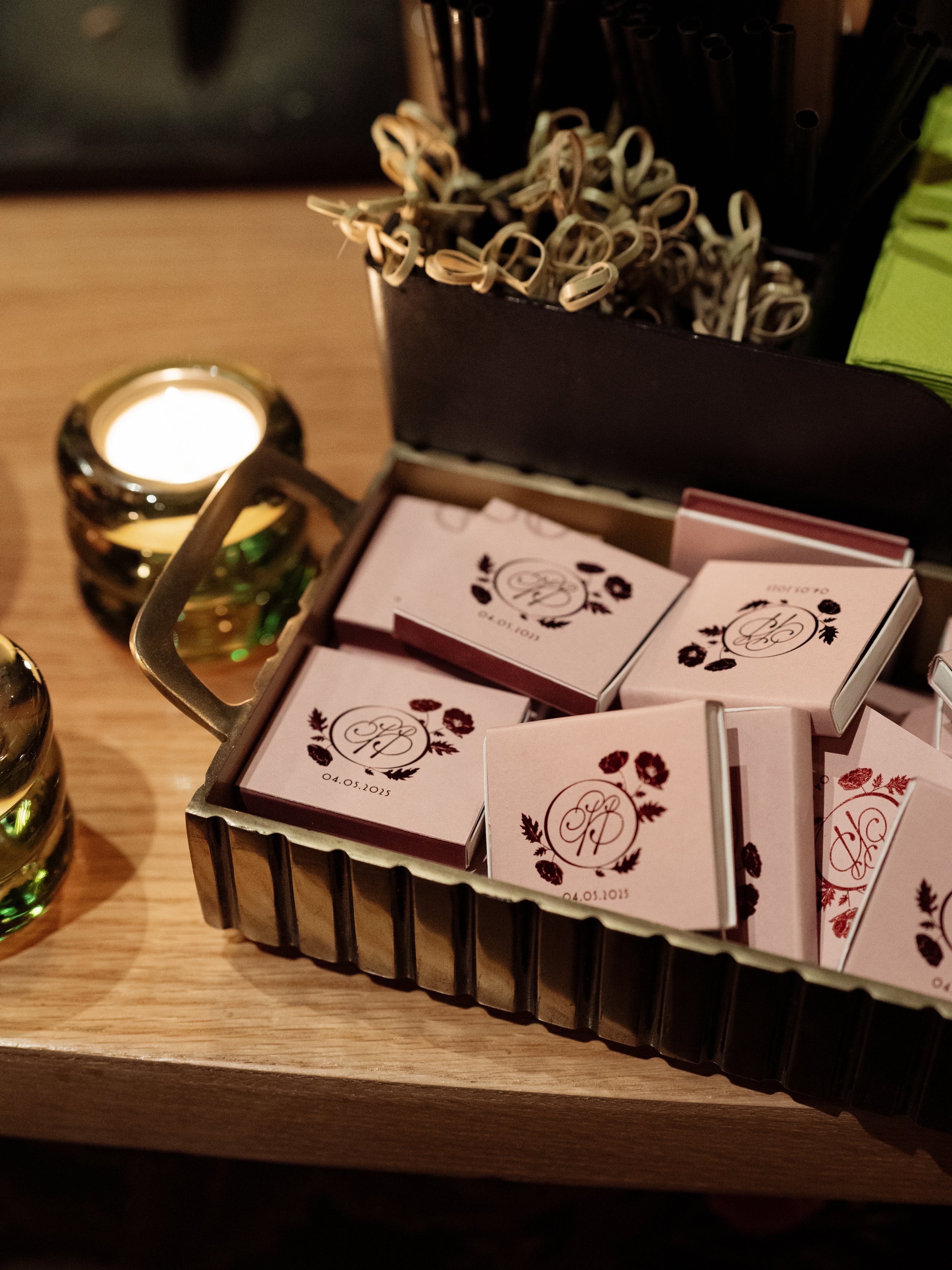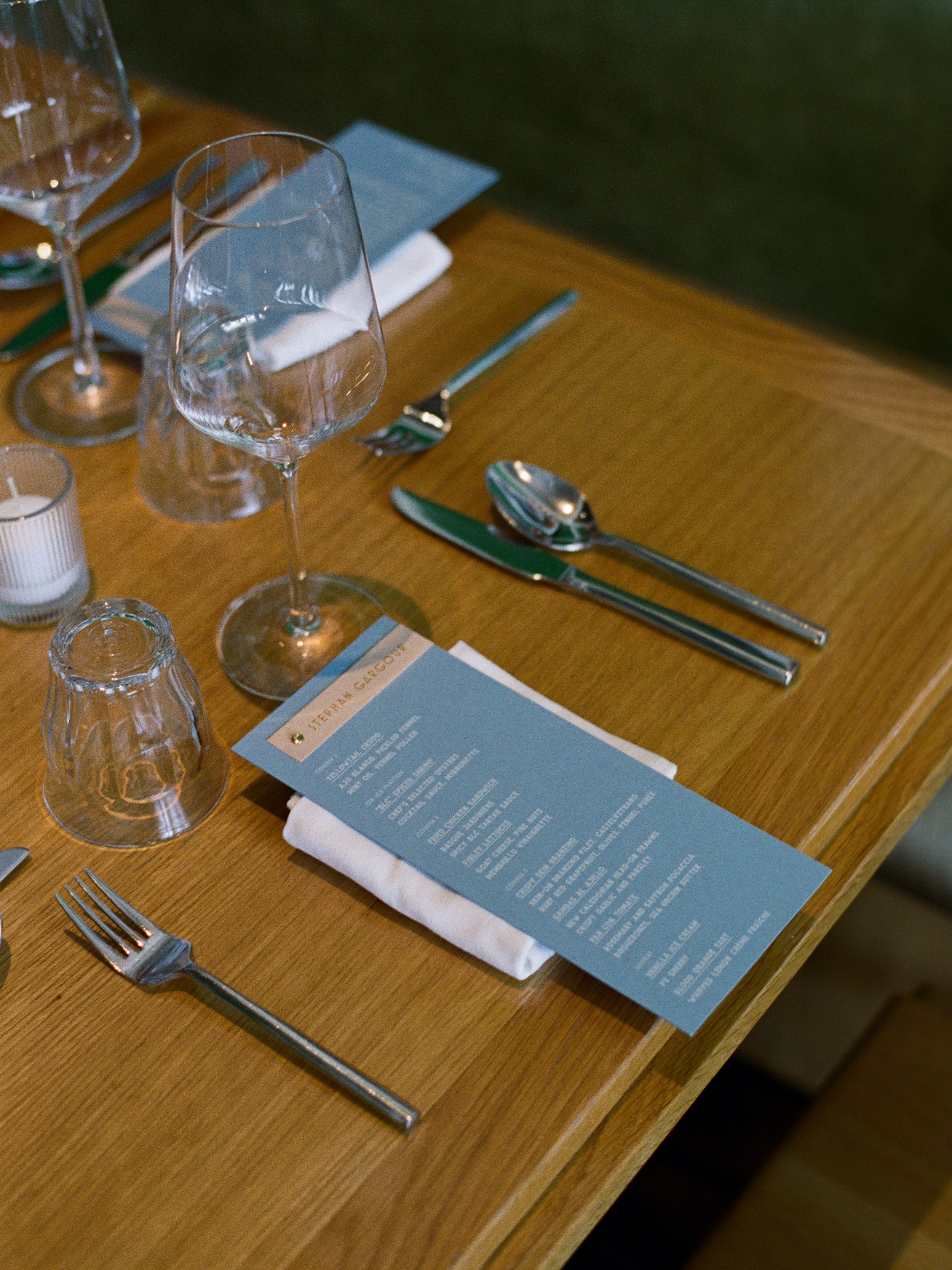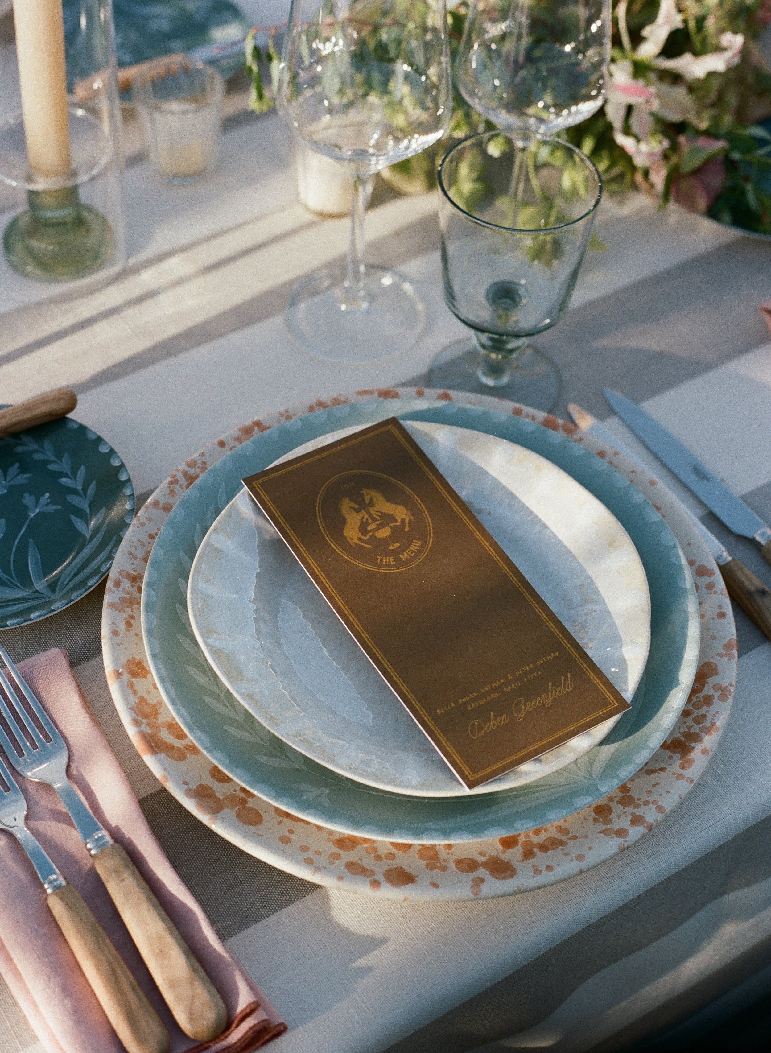 After starting with the stationery, a soft stripe motif was carried into the wedding day linens, creating a seamless thread from first impression to final toast. The palette told its own story: dusty rose mirrored the fashion choices, olive and dusty blue brought senses of calm, while chartreuse and citrus added fresh, modern pops.